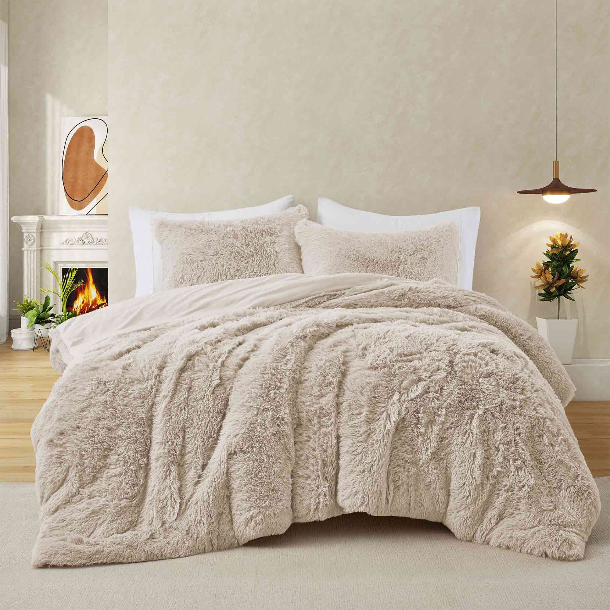 This down alternative comforter set with pillow cases has a fluffy, shaggy front and a velvety soft back. This easy-care duvet insert is the perfect blend of style and winter comfort.
