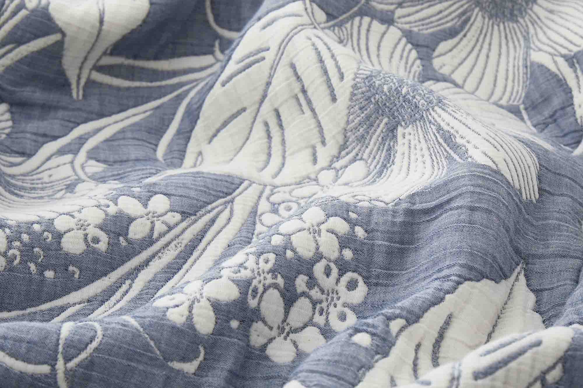 This fabric is made from 100% pure cotton and features a double-layer gauze construction, meaning two ultra-light, breathable cotton layers are woven together to enhance softness, durability, and airflow. The jacquard weave adds an elegant textured pattern directly into the fabric—not printed—giving it a more refined, luxurious look that lasts.