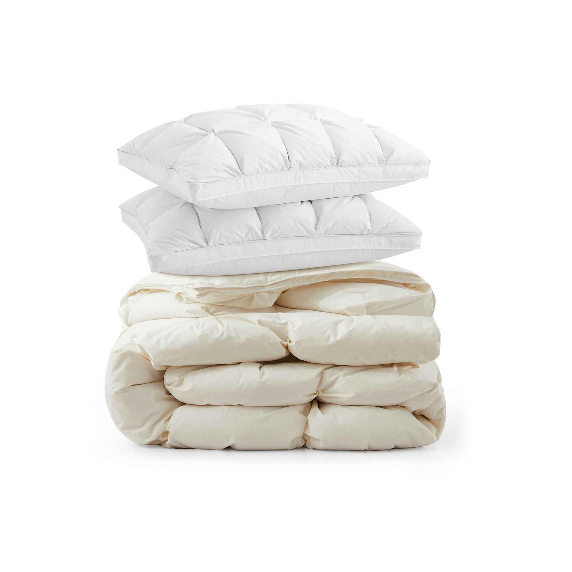 Our Luxury Puff Down Comforter & Pillow Bundle includes one ultra-soft down comforter and two matching down pillows. Designed for year-round comfort, each piece is filled with premium down and encased in a smooth, breathable shell. Create a cozy, cloud-like sleep environment with this essential bedding set.